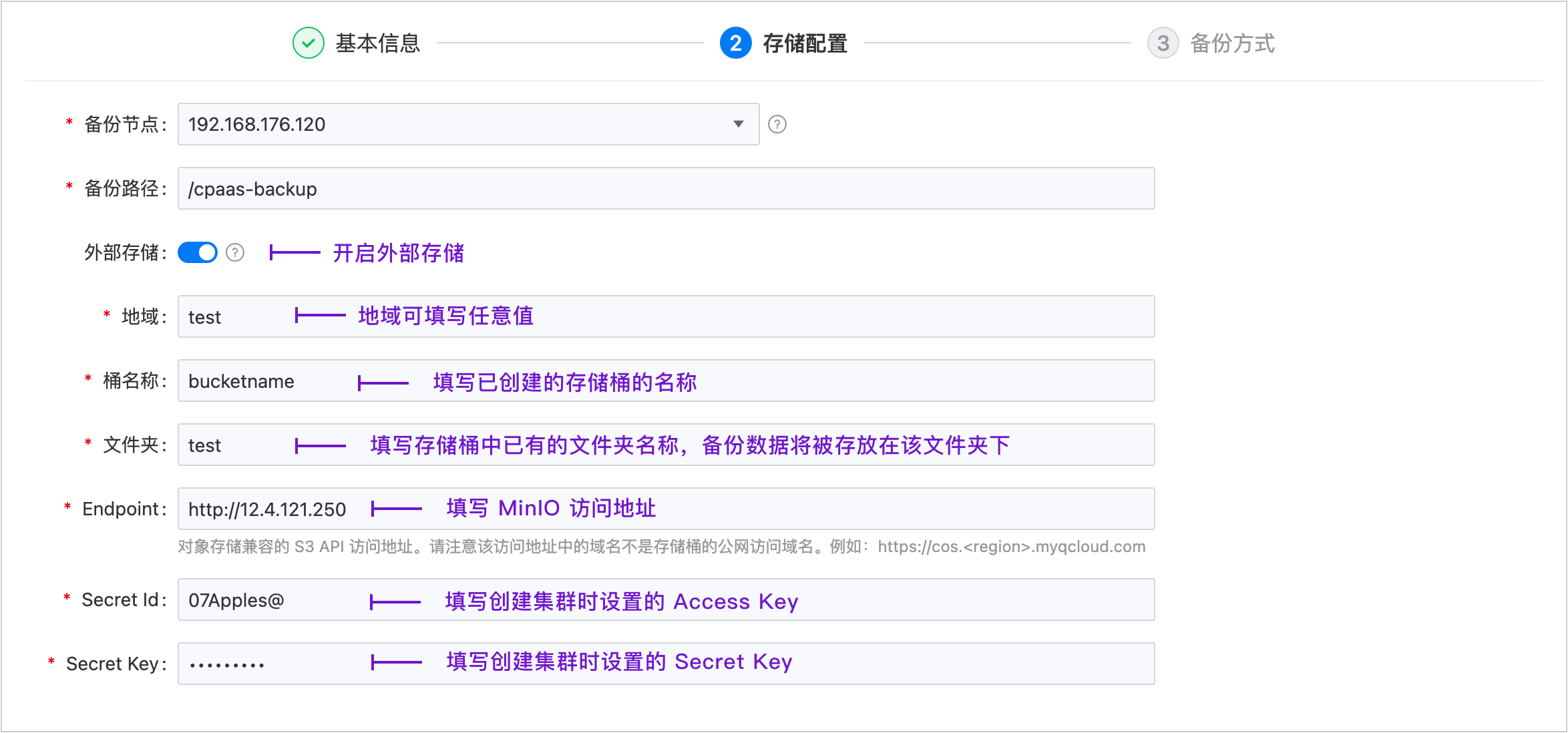 minio endpoint填写步骤 1 中获取的 IP 地址。accessKey和secretKey填写创建集群时的 Access Key 和 Secret Key。- 示例: