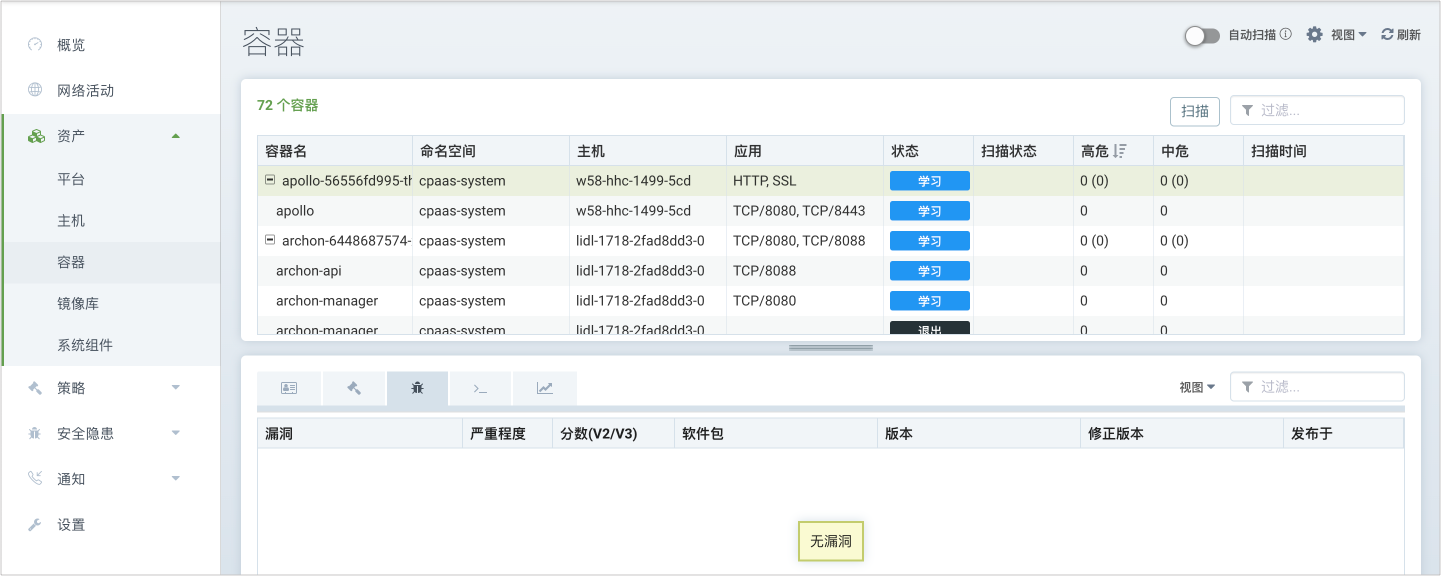 会实时扫描平台上的资源以检测漏洞,有新的节点和容器加入时,自动进行扫描。