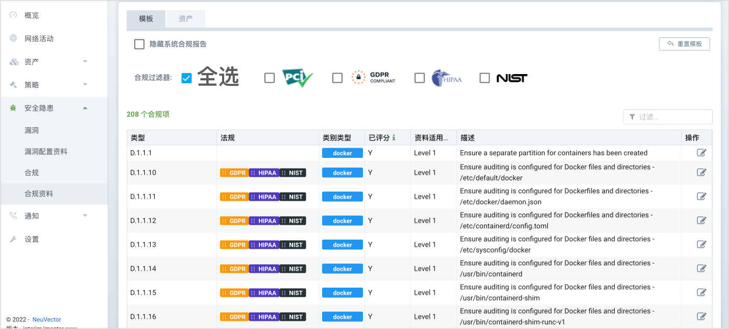 NeuVector 的合规性检查包括 CIS 基线测试、自定义检查、机密审核以及 PCI(Peripheral Component Interconnect,外设组件互联标准)、GDPR(General Data Protection Regulation,通用数据保护条例)和其他法规的行业标准模板扫描。