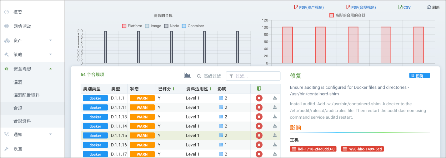 说明:类型 表示对应的基线标准,如 K.4.1.1 对应 Kubernetes CIS 基线测试;容器对应的基线标准为 D 开头,镜像对应的基线标准以 I 开头。