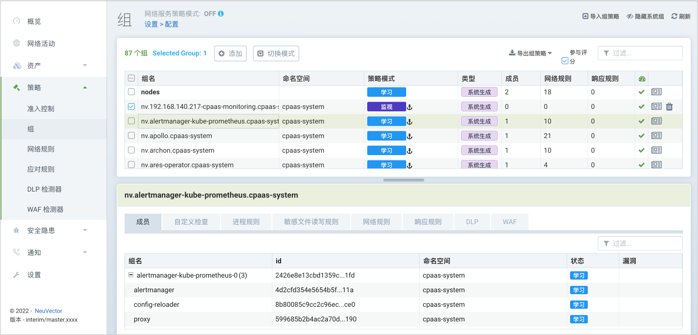 NeuVector 通过组的方式对容器和主机进行管理,对组进行合规性检查、网络规则、进程和文件访问规则、DLP/WAF 的检测配置。