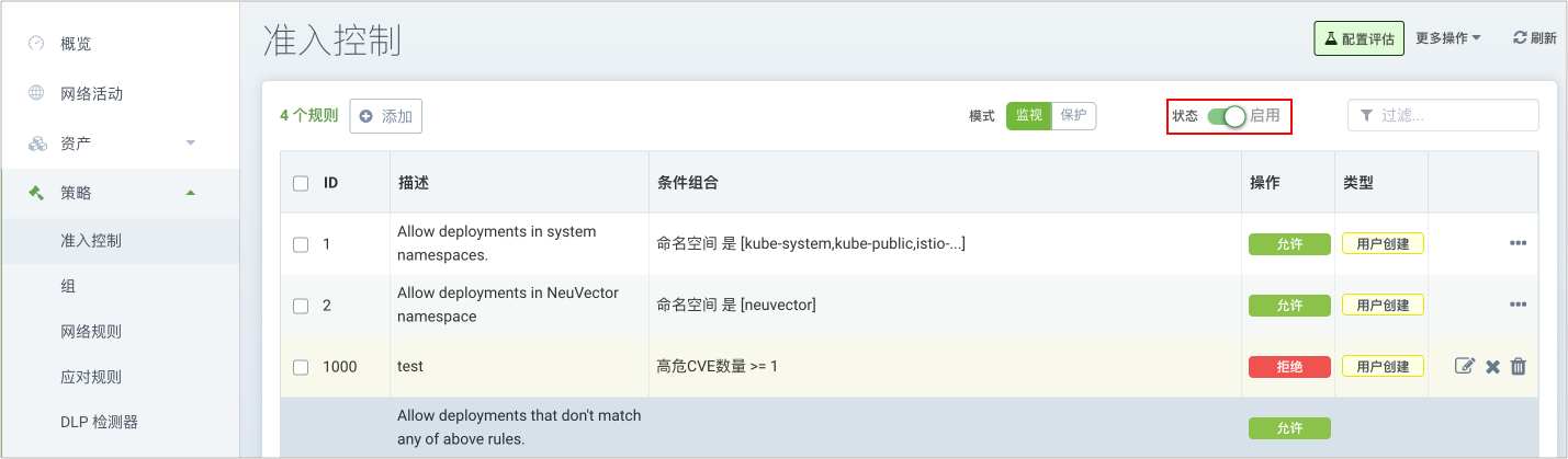 说明:NeuVector 准入策略控制支持 监视 和 保护 2 种模式,对应的含义和组的模式一样的。