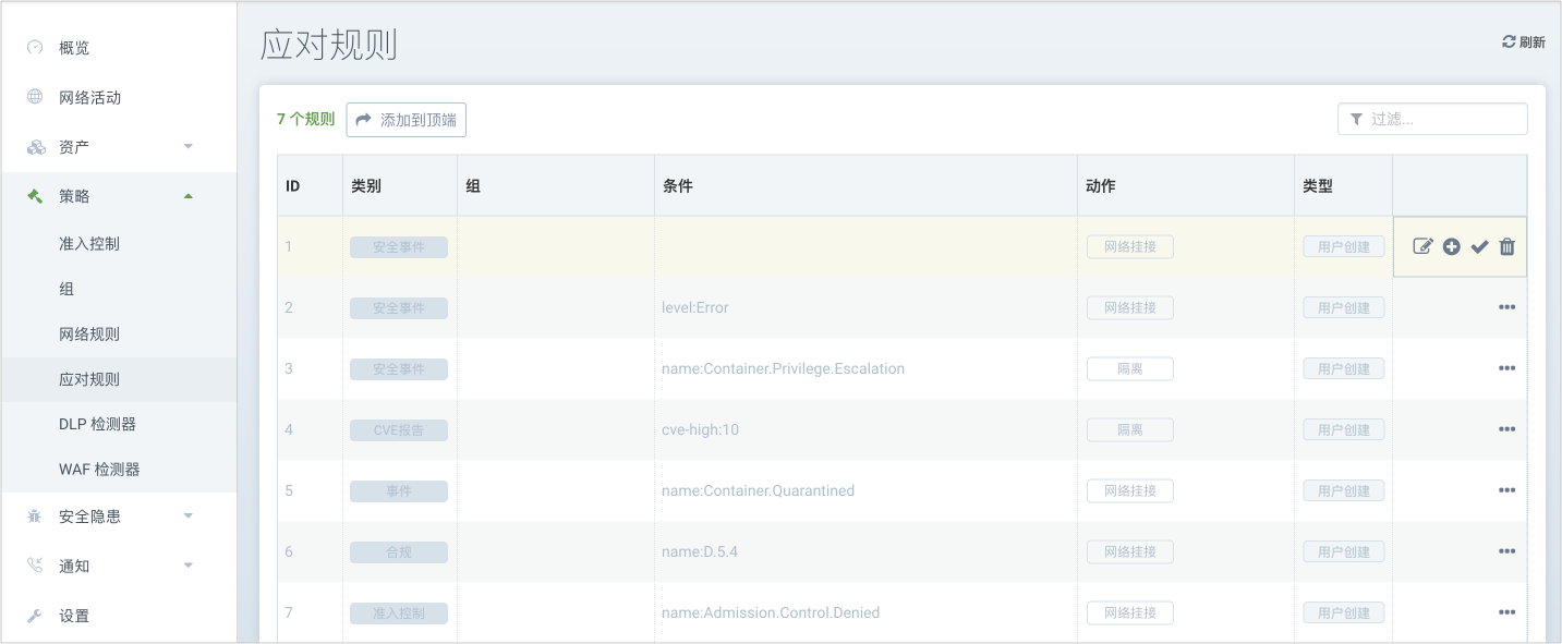 可通过为 NeuVector 事件设置应对规则,让其根据安全事件情况进行动态响应,包括以下事件:漏洞扫描结果、CIS 基准测试、准入控制事件等。