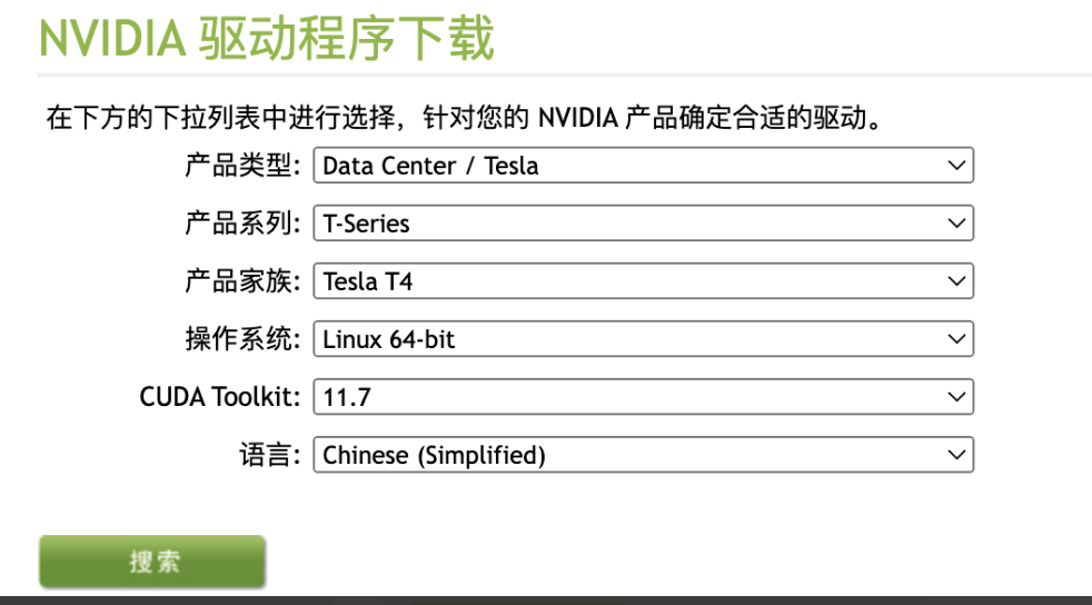 根据 GPU 节点的型号,填写驱动下载所需信息,如下图所示。