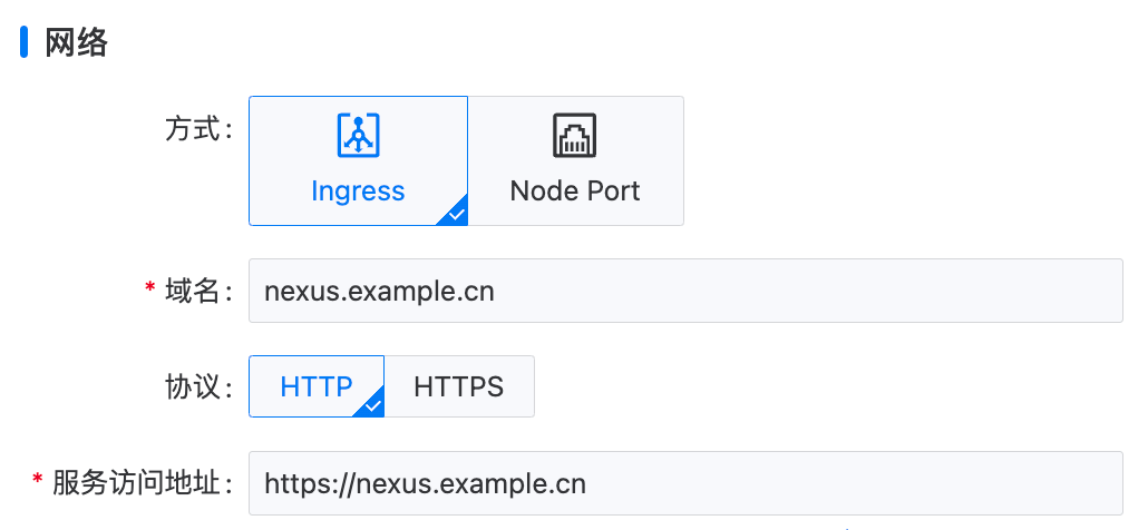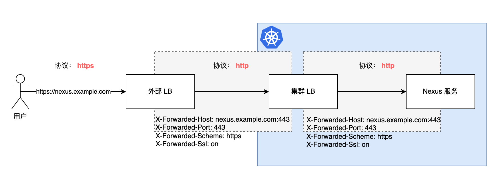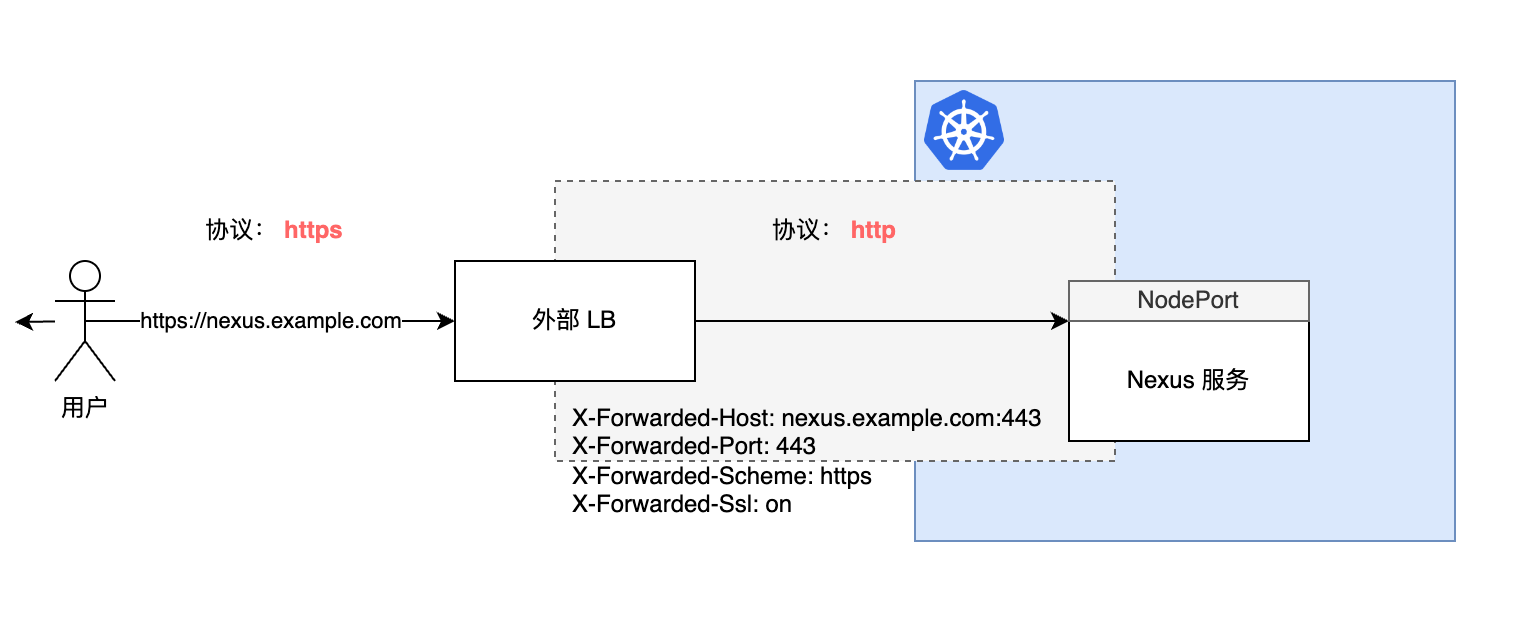 - 通过域名方式(HTTP)部署 nexus,然后通过外部 LB 将流量转发给集群 LB,最后由集群 LB 转发到 Nexus 服务。