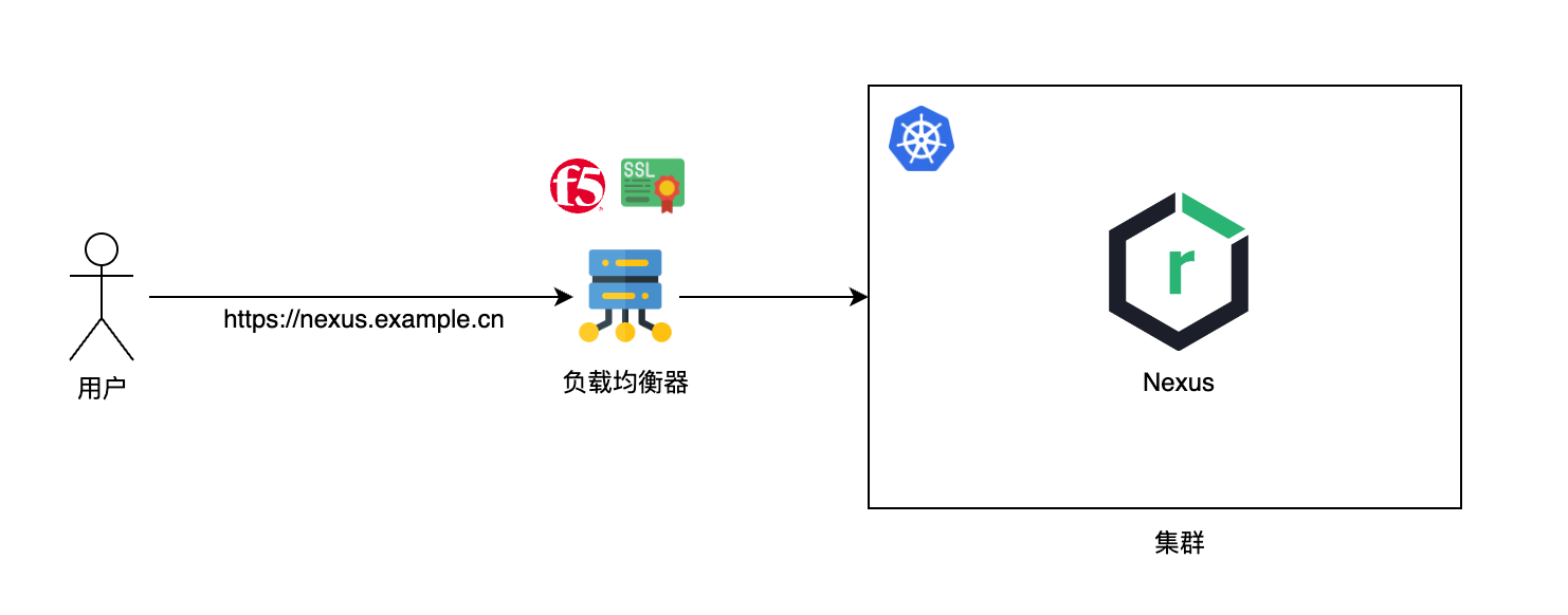 通常情况下,通过域名部署 Nexus 实例时,会将域名证书配置在集群 LB 上。然而,如果希望将域名证书配置在外部 LB(如 f5)上,则需要进行一些额外配置。