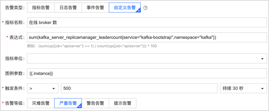 本节所列指标的监控对象均为 Kafka 节点。如果希望监控 Kafka 集群,需要去除 pod 变量,并增加 sum 函数,例如下图表示将对 Kakfa 集群的在线 broker 数进行告警。