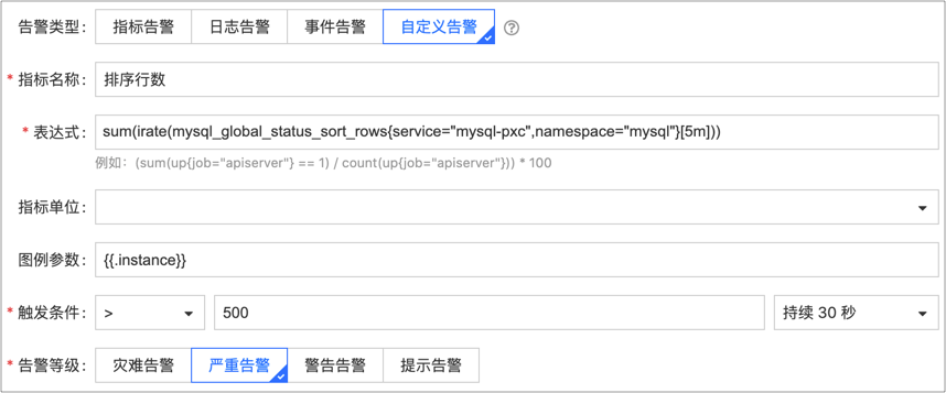 本节所列指标的监控对象均为 MySQL 节点。如果希望监控 MySQL 集群,需要去除 service_name 变量,并增加 sum 函数,例如下图表示将对 MySQL 集群的排序行数进行告警。