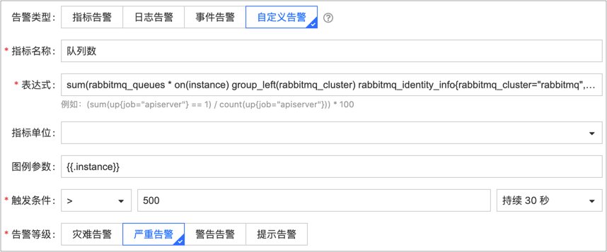 本节所列指标的监控对象均为 RabbitMQ 节点。如果希望监控 RabbitMQ 集群,需要去除 pod 变量,并增加 sum 函数,例如下图表示将对 RabbitMQ 集群的队列数进行告警。