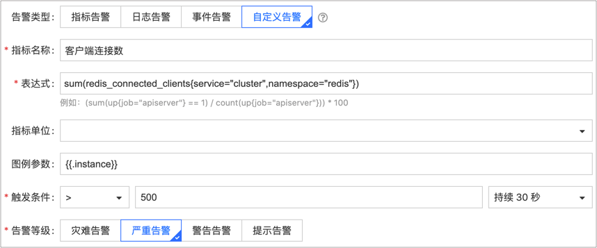 本节所列指标的监控对象均为 Redis 节点。如果希望监控 Redis 集群,需要去除 pod 变量,并增加 sum 函数,例如下图表示将对 Redis 集群客户端连接数进行告警。