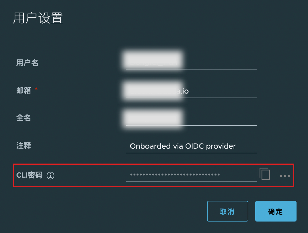 - 下图 用户设置 中的 用户名 和 CLI 密码 也可用于使用 Helm 或 Docker CLI 方式访问 Harbor。