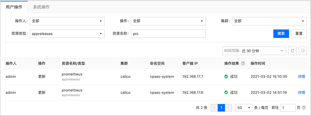 查询条件 说明 操作人 执行操作的账号的用户名或系统账号名称,默认为 全部。操作 执行的操作的类型,可选:创建、更新、删除、管理、回滚、停止等 ,默认为 全部。集群 被操作资源所属集群 ,默认为 全部。资源类型 被操作资源的类型,默认为 全部。资源名称 被操作资源的名称。可按资源名称进行模糊搜索。 -