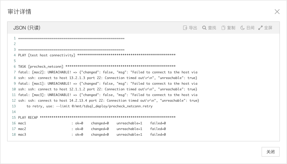 参数 说明 操作人 执行操作的账号的用户名或系统账号名称。 操作 执行的操作的类型,例如:创建、更新、删除、管理、回滚、停止等。 资源名称/类型 被操作的资源的名称及类型。 集群 被操作资源所属集群。 命名空间 被操作资源所属命名空间。 客户端 IP 执行操作的用户登录平台所用的客户端的 IP 地址。 操作结果 操作的执行结果,通过 API 返回码判断。API 返回码为 2xx 时,操作成功;返回码为其他时,则操作失败。 操作时间 操作人执行操作的时间。 详情 单击审计记录右侧的 详情 按钮,可在弹出的 审计详情 对话框中 JSON(只读) 区域查看审计记录的详细信息。