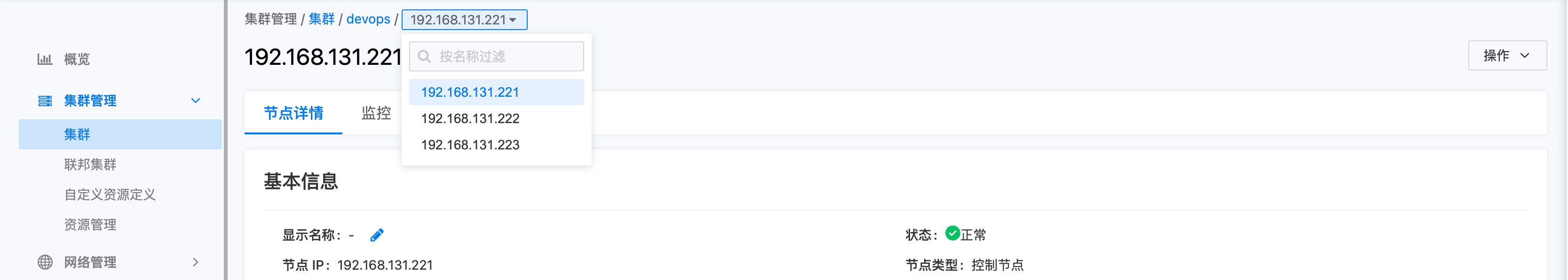 当集群下的节点个数大于 1 个时,在节点的详情页面,单击资源路径区域的 当前节点名称 可展开节点下拉列表,单击选择节点后可快速切换至其他节点的详情页面,如下图所示。
