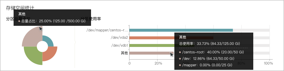 分区使用率条形图中,使用率从高到底排序的前 3 个分区会单独显示条形图,剩余分区显示为 其他 条形图,且光标移动至条形图时,显示剩余分区的总使用率及各自的使用率。