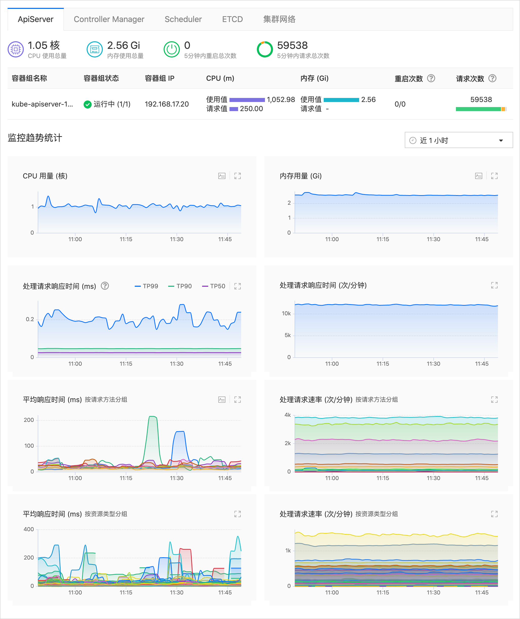 每个组件的监控信息主要由 监控概览、组件容器组列表、监控趋势统计 3 部分组成,如图所示(以 ApiServer 为例)。详细的监控信息说明参见 参考信息 。