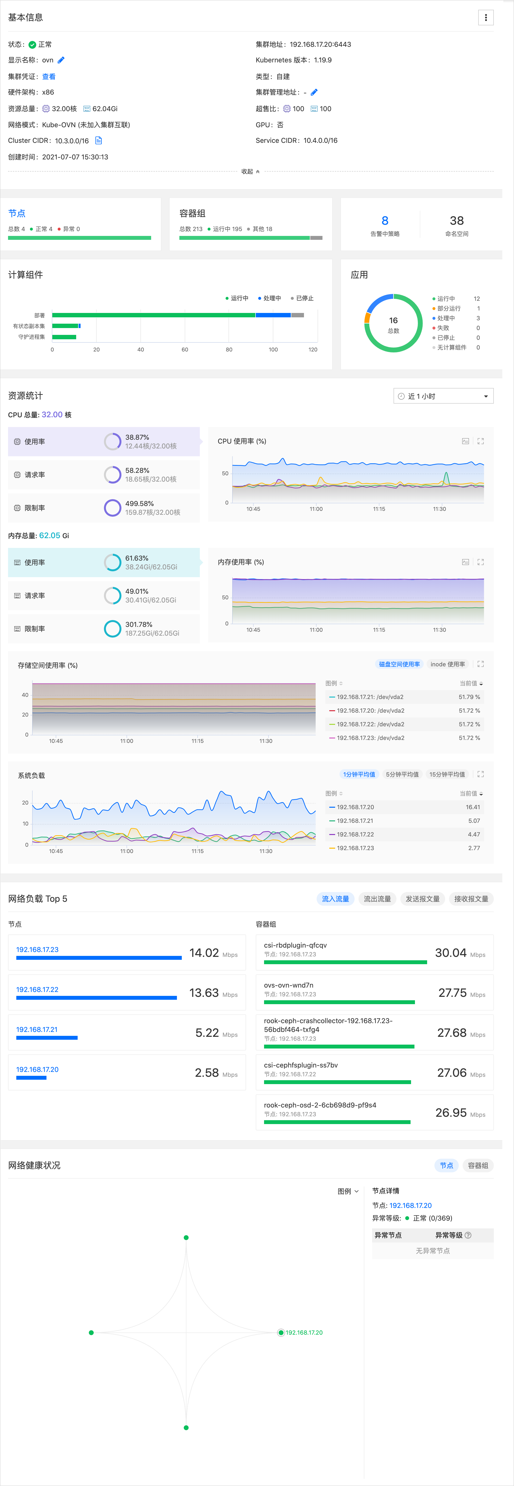 集群概览:查看集群的基本资源监控信息,包括:资源运行情况、资源使用情况、资源趋势统计数据、网络负载统计数据及网络健康状态。