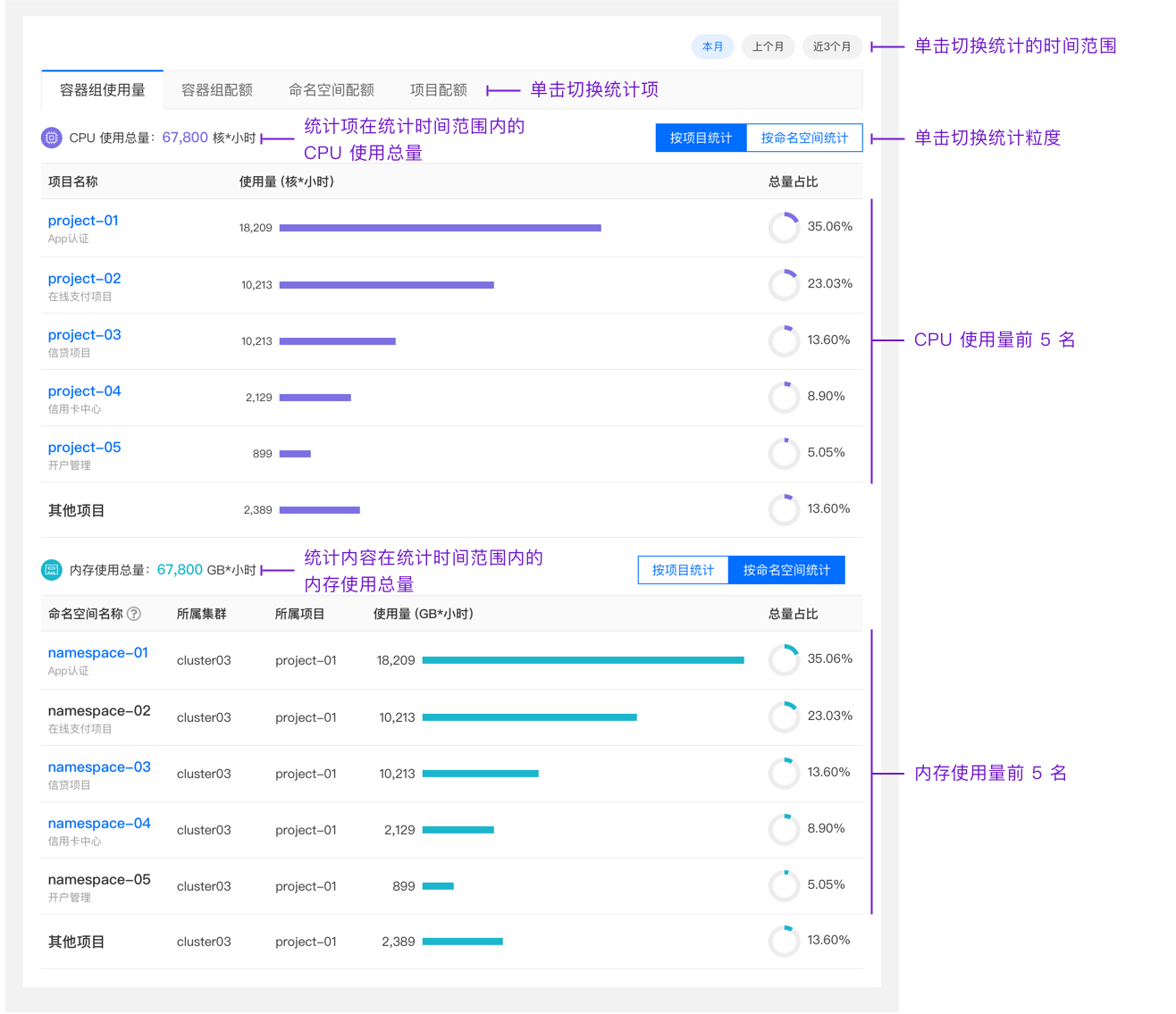 支持查看本月(默认)、上个月、最近 3 个月(本月和前两个整月)的项目配额,并按项目或命名空间统计容器组使用量、容器组配额、命名空间配额、CPU/内存使用总量。