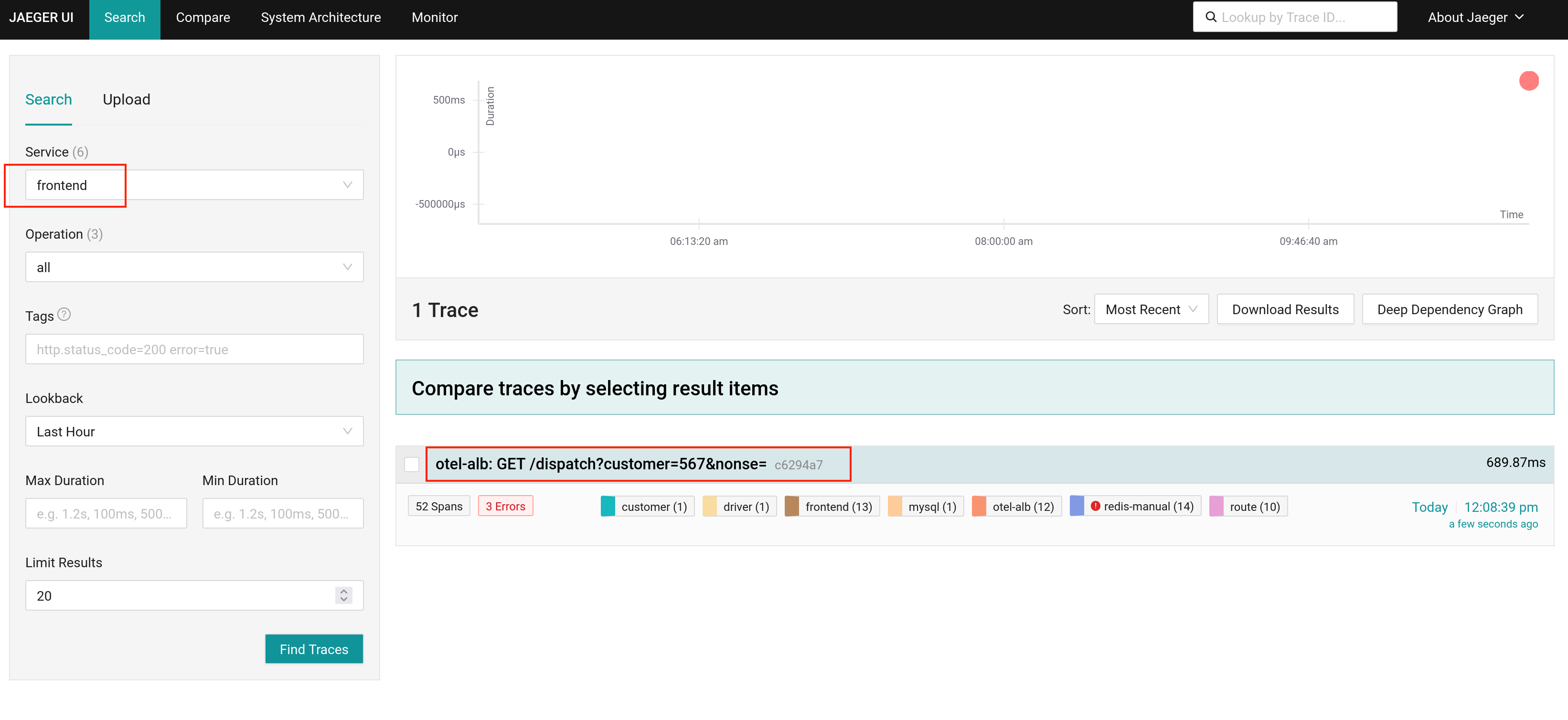 打开 步骤 3 中获取的 Jaeger 的访问地址查看结果。