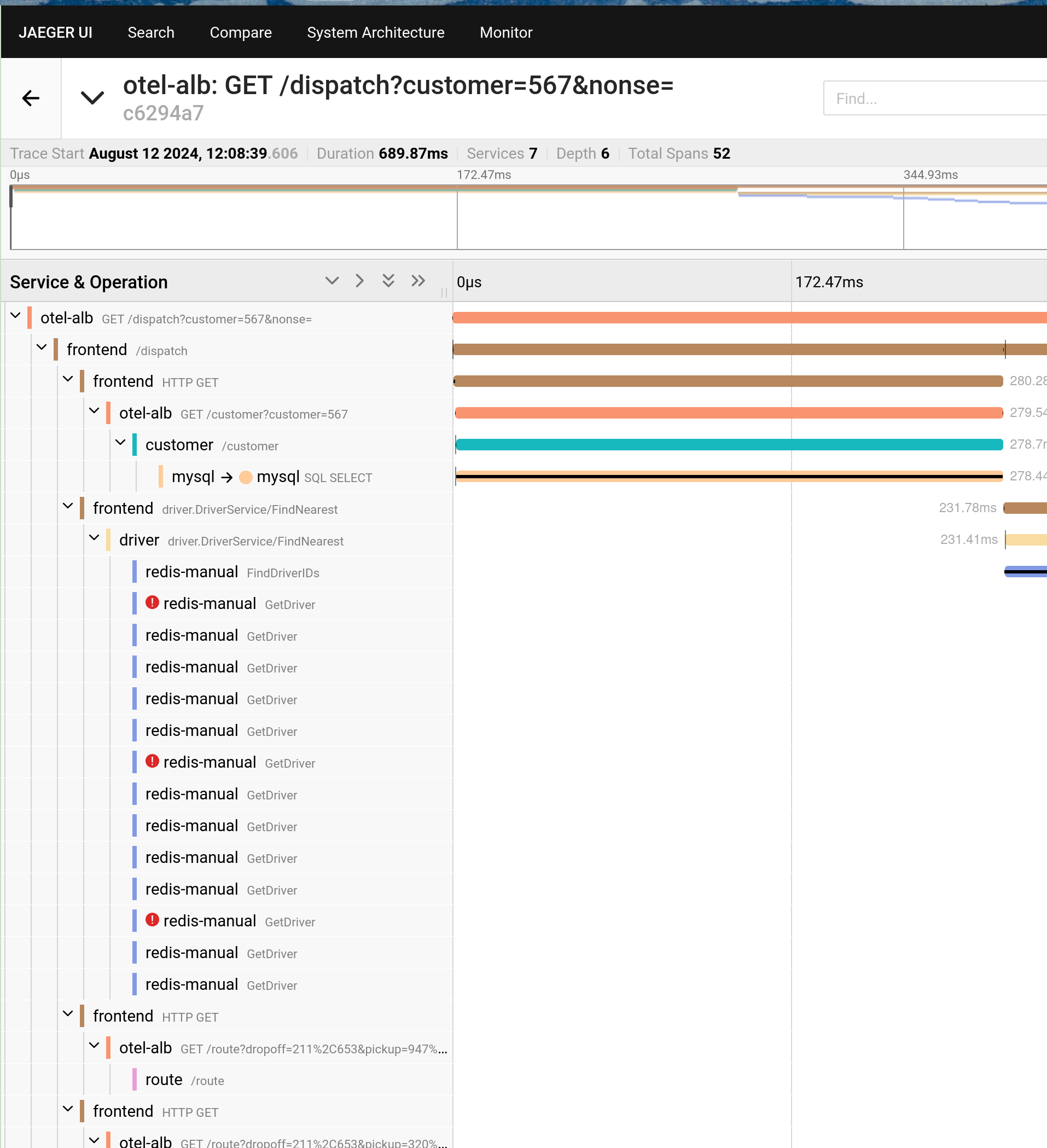curl -v "http://<$ALB_IP>:80/dispatch?customer=567&nonse=" # 使用上述步骤中获取的 otel-alb 访问地址替换命令中的 <$ALB_IP> 部分 -