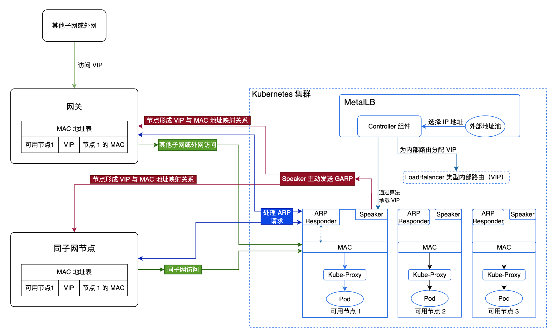 | ARP Responder | MetalLB 的组件,主要作用是响应 ARP 请求,将 VIP 映射到节点的 MAC 地址。当节点需要与 VIP 进行通信时,它们会发送 ARP 请求以获取 VIP 对应的 MAC 地址,每个可用节点上的 ARP Responder 负责响应这些 ARP 请求,将 VIP 映射到节点的 MAC 地址。 |