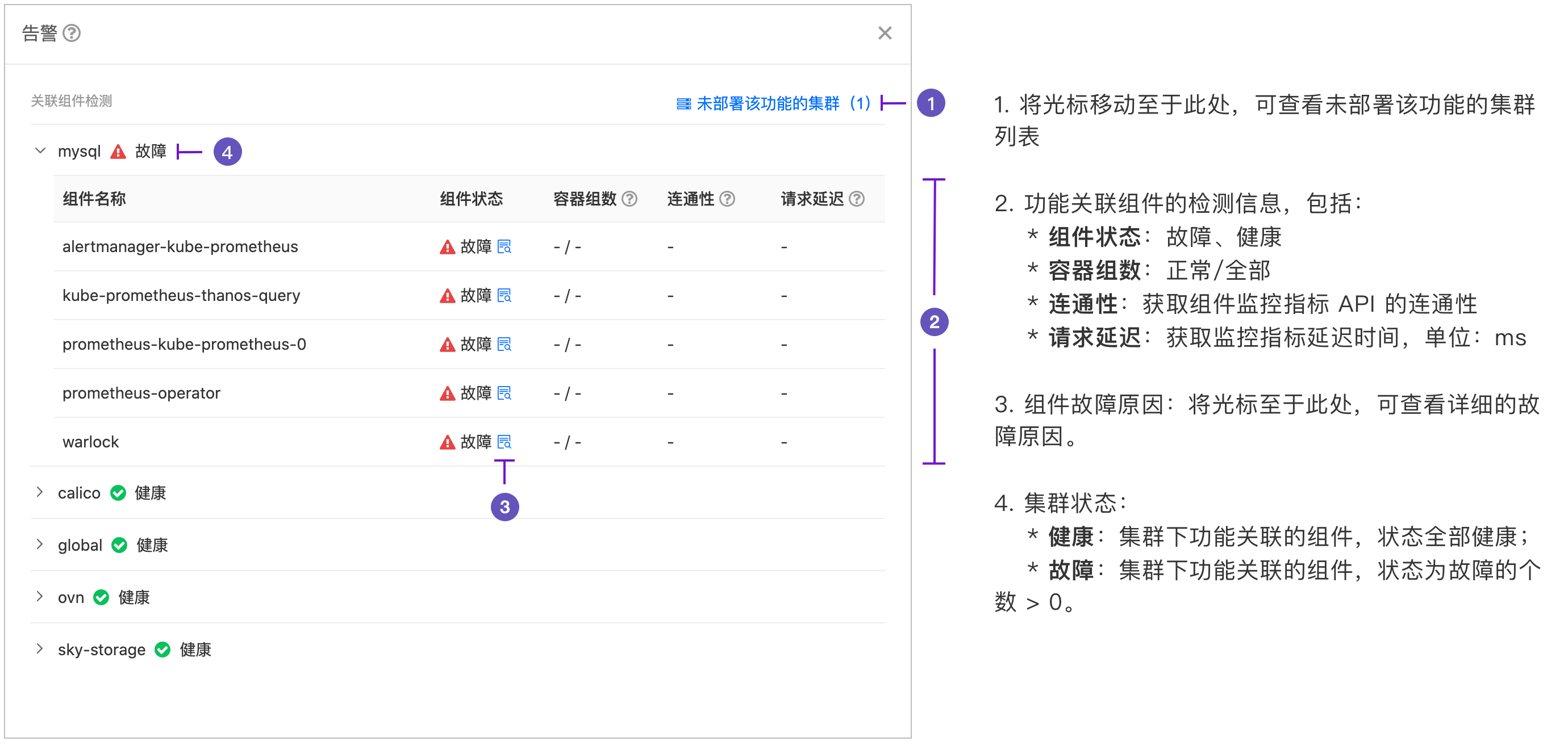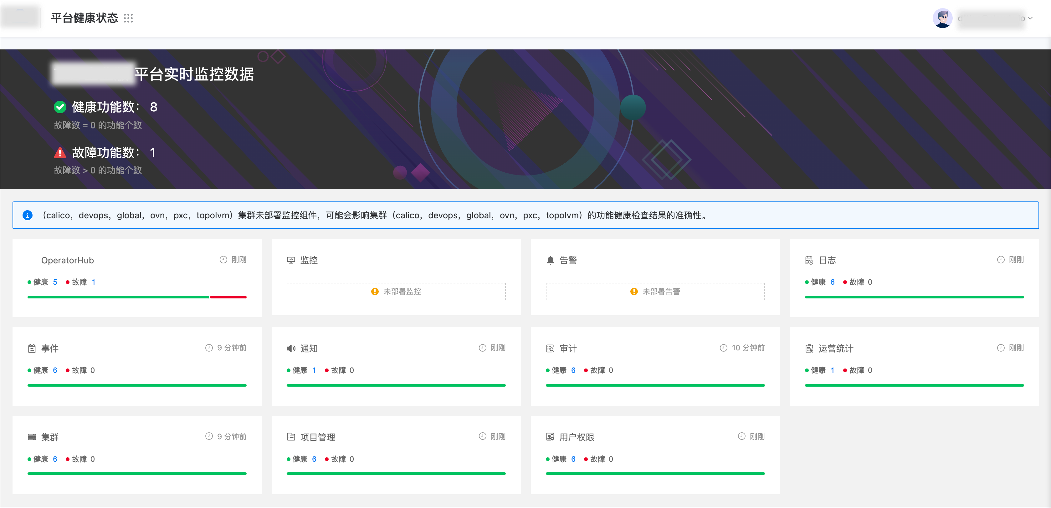 平台健康状态页面,将为您呈现平台已部署功能的健康状态统计数据。当您的账号拥有平台管理、平台审计相关权限时,您还可以查看指定功能的详细健康数据,包括:未部署该功能的集群列表、部署了该功能的集群的健康状态以及该功能关联的集群下的组件的检测数据。能够帮助您快速定位问题,提升平台运维效率。