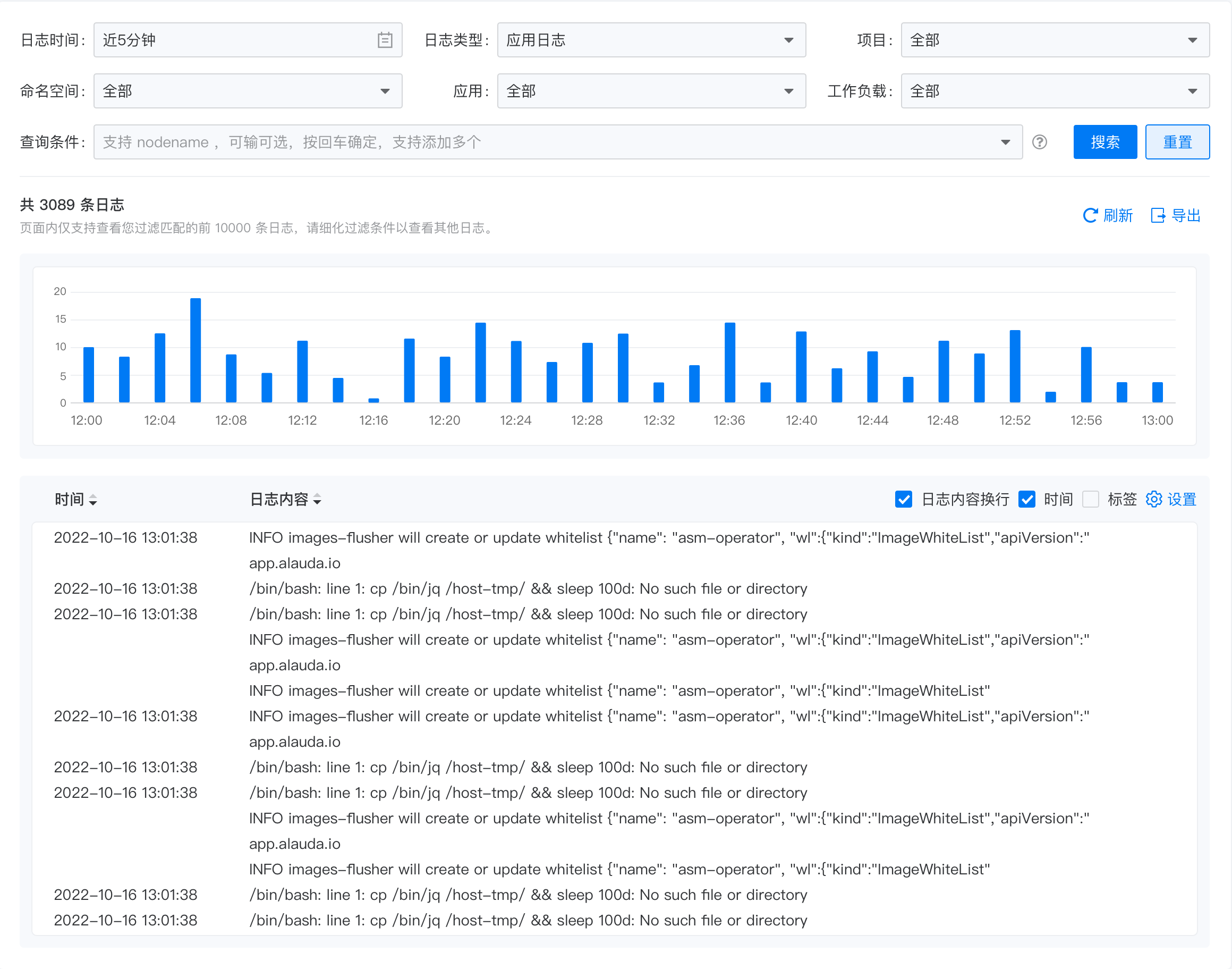 支持通过日志查询条件筛选指定时间范围内(选择或自定义)的日志,并通过柱状图以及标准输出展示日志查询结果。
