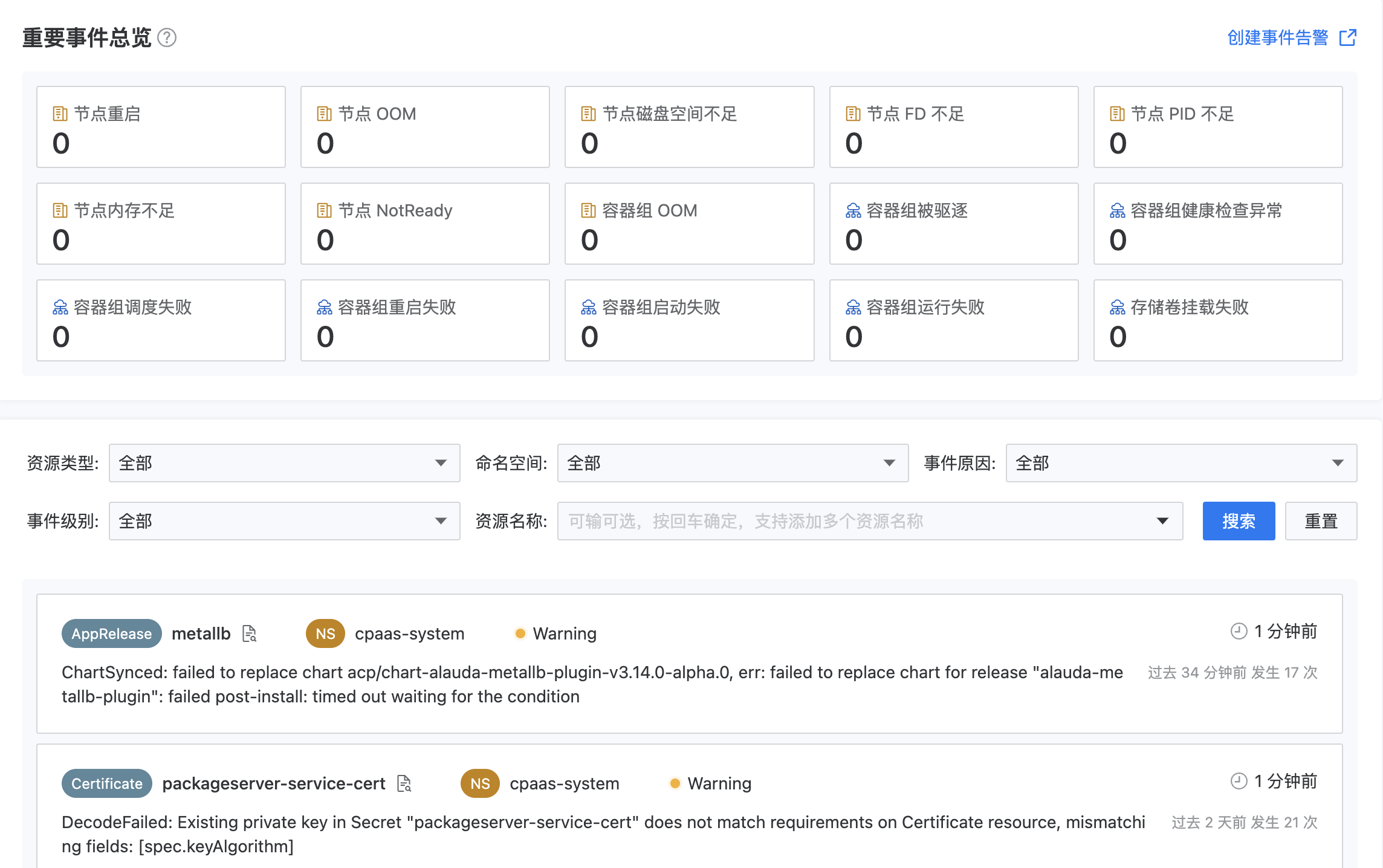 在事件页面默认展示最近 30 分钟内(可选择或自定义时间范围)的重要事件总览以及资源事件记录。