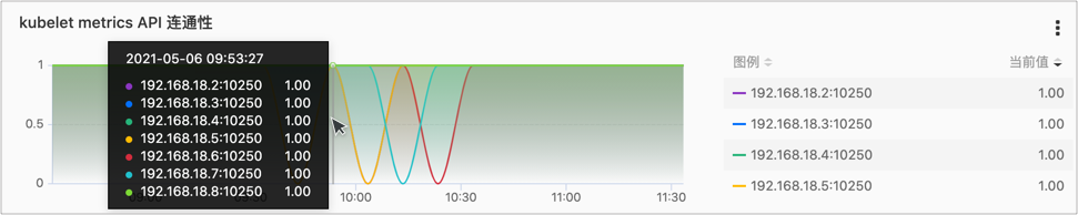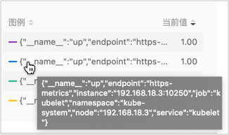 例如:通过表达式up{service="kubelet"}获取到的监控数据的标签包含"__name__":"up","endpoint":"https-metrics","instance":"192.168.18.2:10250","job":"kubelet","namespace":"kube-system","node":"192.168.18.2","service":"kubelet"}",如果想使用收集数据的目标端点作为图例标识,可输入图例参数{{.instance}}。显示效果如下图所示。