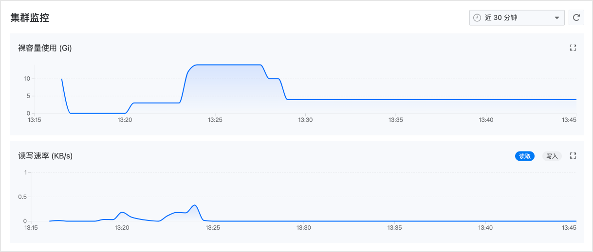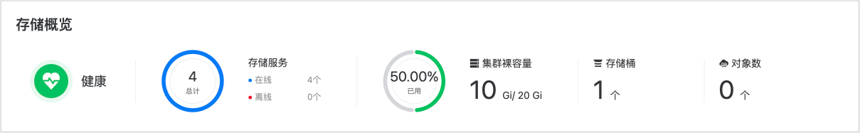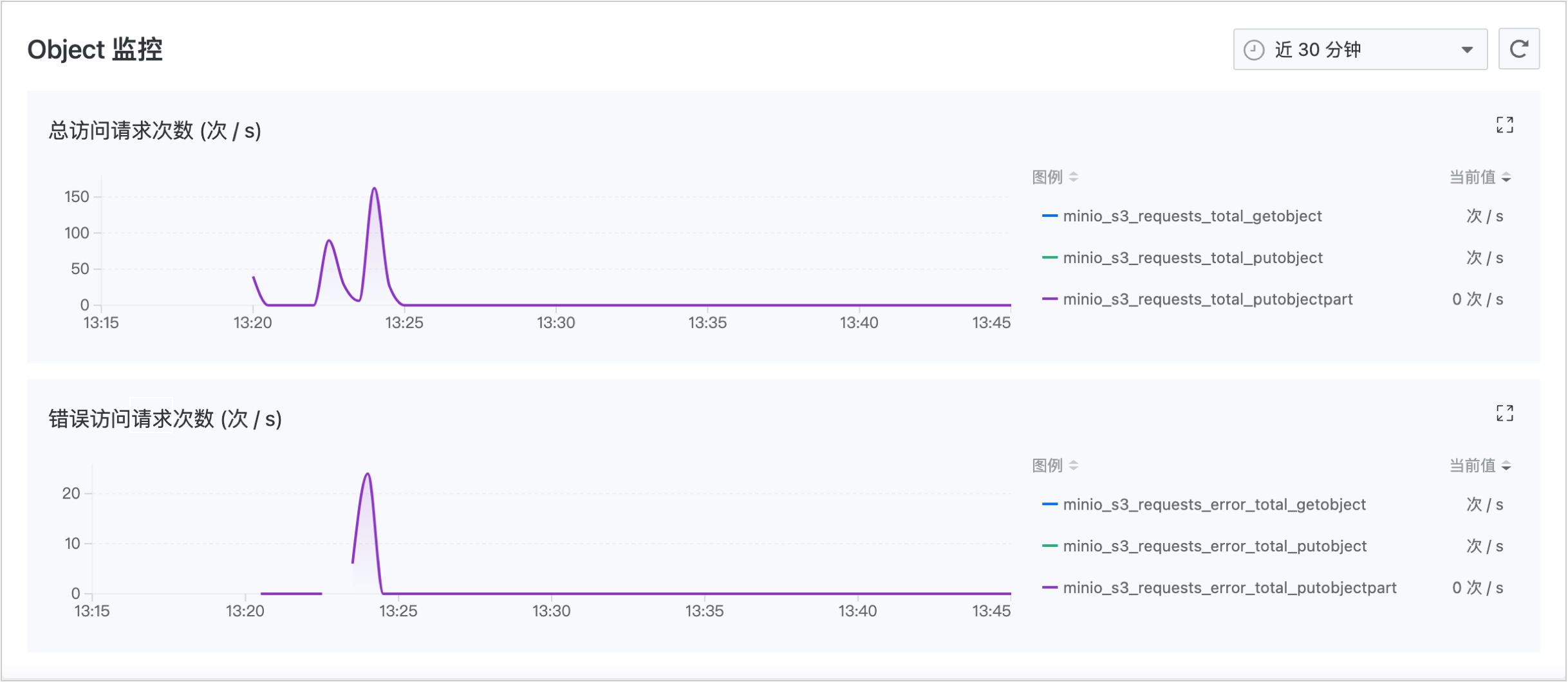 平台默认会收集对象存储的集群和存储服务状态。在 存储管理 > 对象存储 的 监控 页签中,可查看指标的实时监控数据。