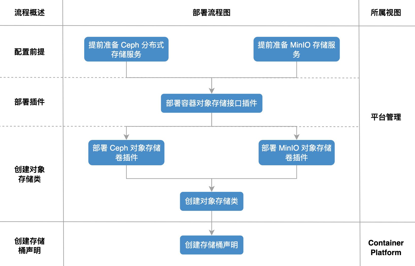 存储桶是一个集群级别的自定义资源,概念类似于 PV,为各对象存储中的 Bucket 定义了一个抽象概念。在容器平台的业务人员可创建 存储桶声明,平台将自动创建存储桶并与之绑定,在平台管理中您可查看存储桶相关信息。