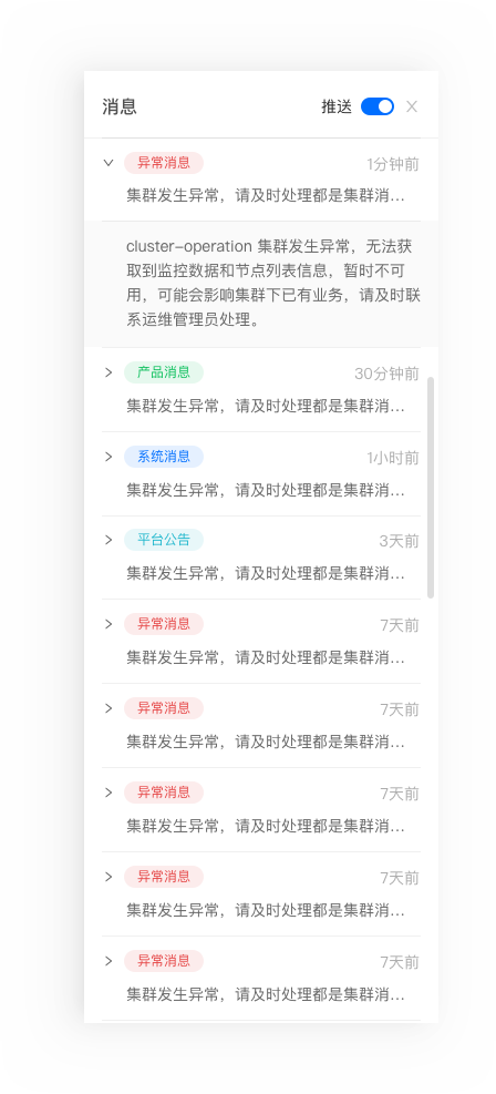 异常消息:全局资源的状态消息,例如:集群异常、主机异常、产品运行异常、监控组件异常、日志组件异常等;