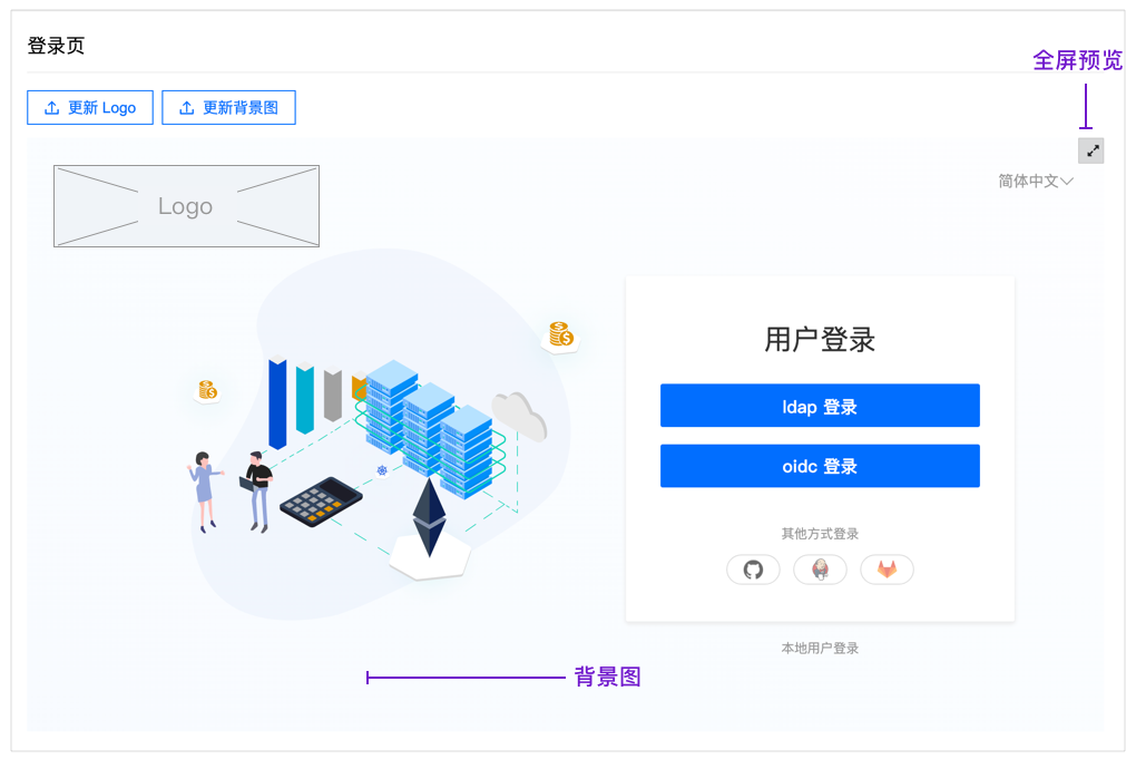 支持使用自定义 Logo 和背景图片替换平台部署时默认的登录页 Logo 和背景图片。
